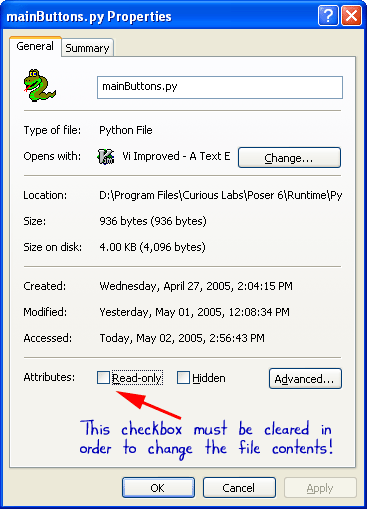 To make the "mainButtons.py" writable, open up Windows Explorer and change to the Poser home directory. From there enter the "Runtime" folder, then the "Python" folder and finally the "poserScripts" folder. Now click once on the "mainButtons.py" file to select it. Select "Properties" from the Windows Explorer "File" menu and you will see a dialog box that looks like this one (link opens in a new window). Make sure that the "Read-Only" checkbox is cleared and then click on "OK". If that wasn't the problem, once again you'd better contact us and we will try to determine what else may be causing the problem.